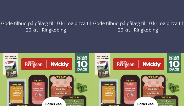 Kvickly tilbyder et udvalg af pålæg som Kylling klassisk, Sønderjysk spegepølse, Bamsepålæg, Rullepølse og Hamburgerryg til kun 10 kr. pr. pakke (70-90 g). Bemærk, at der er tale om et begrænset parti. Tilbuddet gælder fra tirsdag den 7. april til torsdag den 16. april.